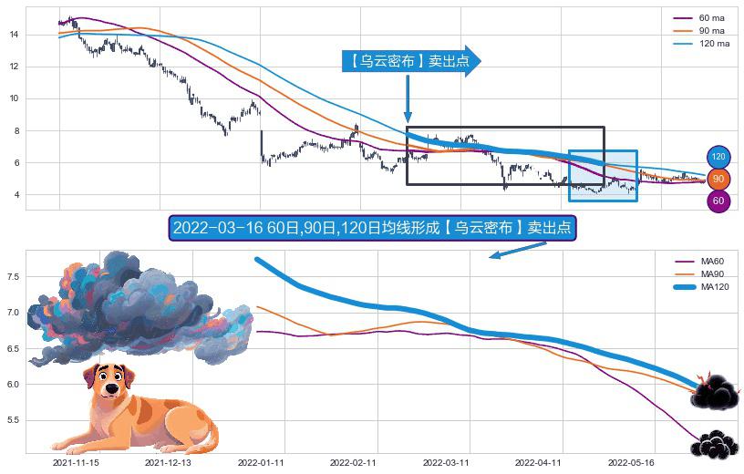 ⚀ 2022-01-03日-2022-05-31日显现 60日-90日-120日均线 【乌云密布】卖出点 看空信号,后市看跌,卖出