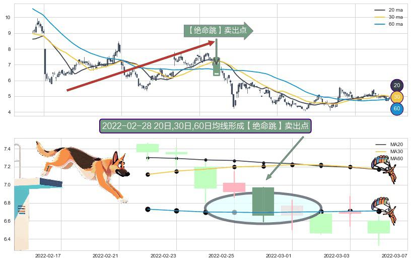 ⚀ 2022-02-28日显现 20日-30日-60日均线 【绝命跳】卖出点 看空信号,后市看跌,卖出