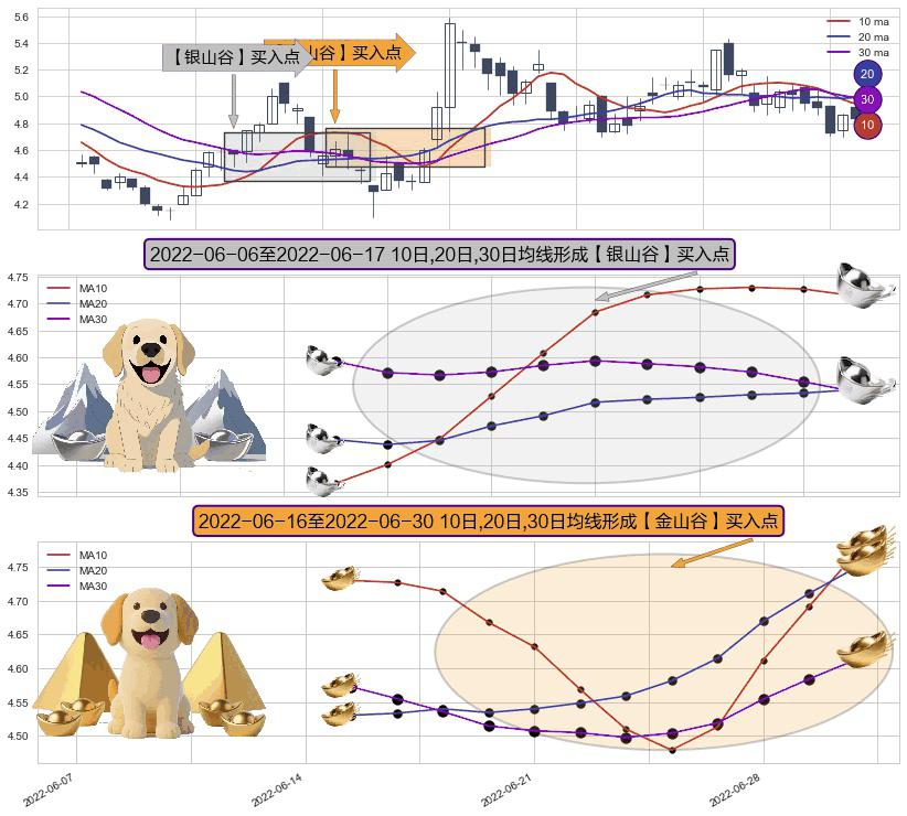 ⚂ 2022-06-17-日至2022-06-30-日显现 10日-20日-30日均线 【金山谷】买入点 其再次确认了买入信号,可靠性更强,买入