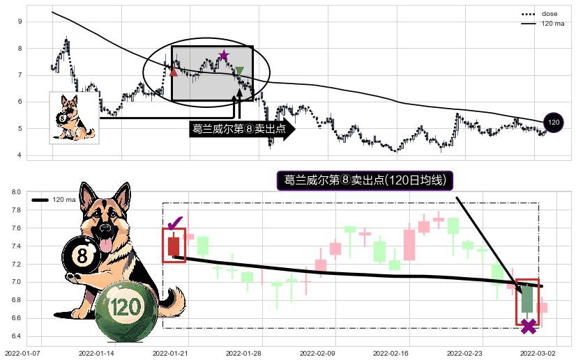 ⚀ 2022-02-28-日显现 葛兰威尔均线 120日均线 第⑧卖出点 下降趋势的中继信号,后市看跌,卖出信号