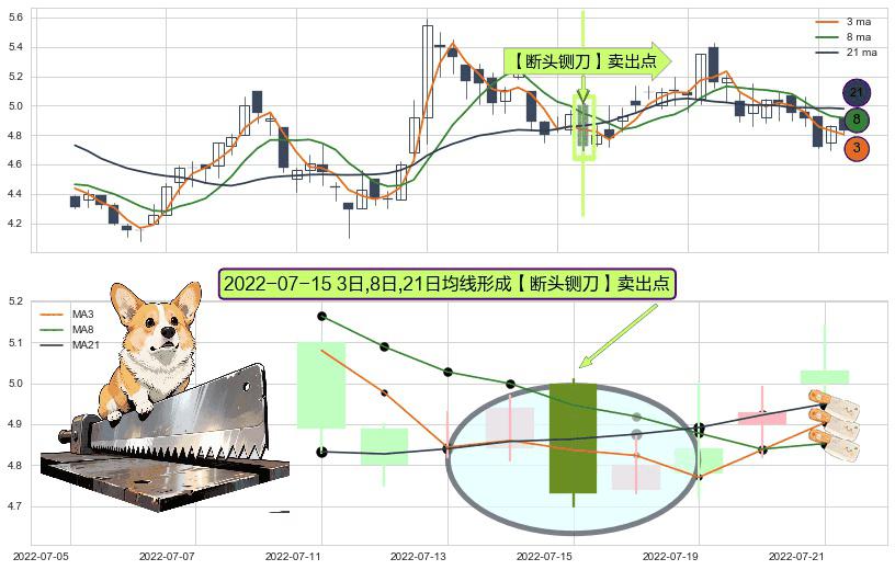 ⚀ 2022-07-15日显现 3日-8日-21日均线 【断头铡刀】卖出点 看空信号,后市看跌,卖出