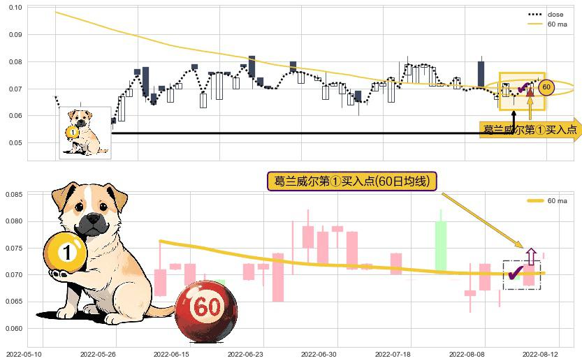 形态多维评估: ⚀ 2022-08-11-日显现 葛兰威尔均线 60日均线 第买①入点 走势反转见底信号,后市看涨,买进信号