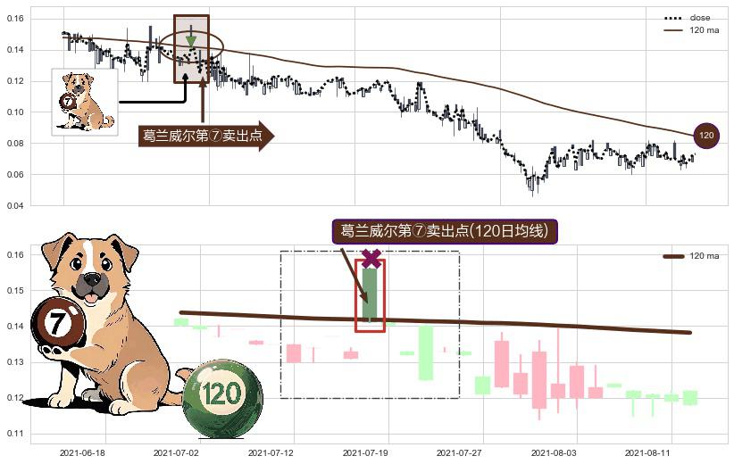 形态多维评估: ⚀ 2021-07-16-日显现 葛兰威尔均线 120日均线 第⑦卖出点 下降趋势的中继信号,后市看跌,卖出信号