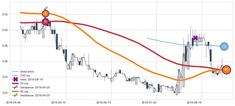 下跌趋势2019-04-08-2019-08-30,均线40, 70确认关键阻力1处