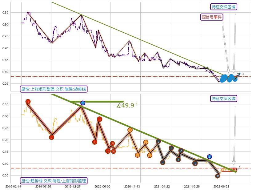 ♘ 在最后的下跌阶段2021-04-23至2022-04-04,存在 持续未破位的阻力位 ,阻力价格0.0922051,可信任强度78.86%,其距离最后价格0.0730000相差 +26.31%