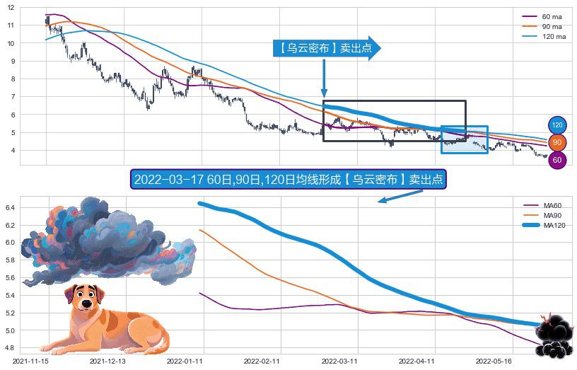 ⚀ 2022-01-10日-2022-05-27日显现 60日-90日-120日均线 【乌云密布】卖出点 看空信号,后市看跌,卖出