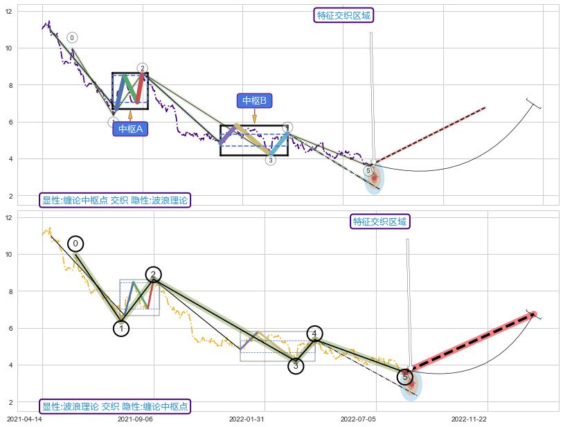 ➢ 【中枢B】:2021-12-30-2022-04-08,中枢由4笔构成,共68交易日, ZG=5.36, ZD=4.83