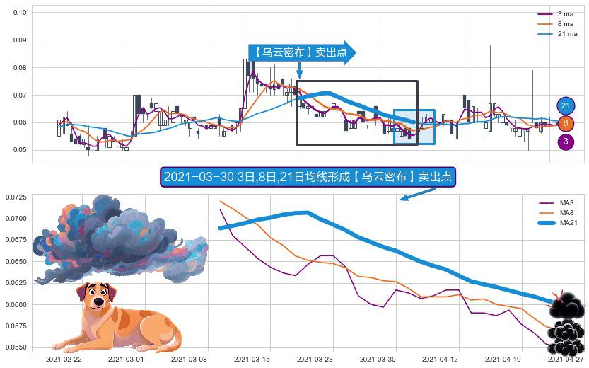 ⚀ 2021-03-09日-2021-04-23日显现 3日-8日-21日均线 【乌云密布】卖出点 看空信号,后市看跌,卖出