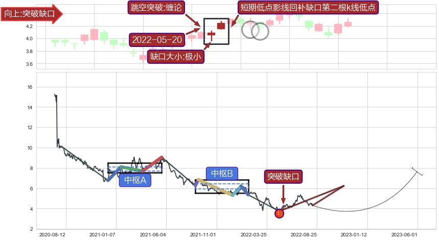 ➢ 突破缺口形成后,后续k已经超过14根,跳空突破缠论买卖点关键点后, 出现【轻微回踩】迹象,短期低点影线回补缺口第二根k线低点