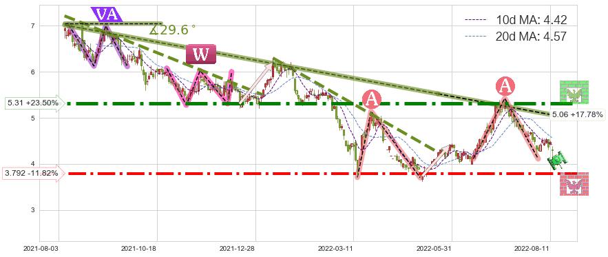 ♘ 阻力价格位5.31,可信任强度95.42%,距离最后交易2022-08-12形成的收盘价格4.30相差 +23.50%