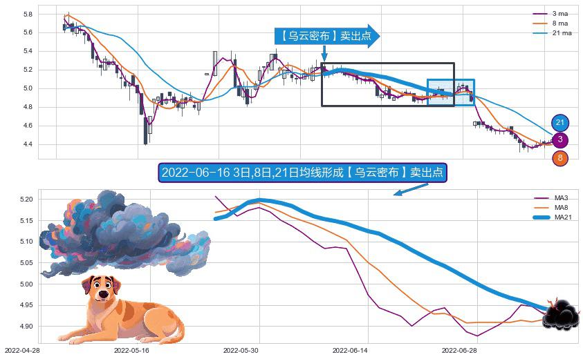⚀ 2022-05-24日-2022-07-08日显现 3日-8日-21日均线 【乌云密布】卖出点 看空信号,后市看跌,卖出