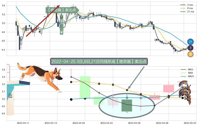 ⚀ 2022-04-25日显现 3日-8日-21日均线 【绝命跳】卖出点 看空信号,后市看跌,卖出