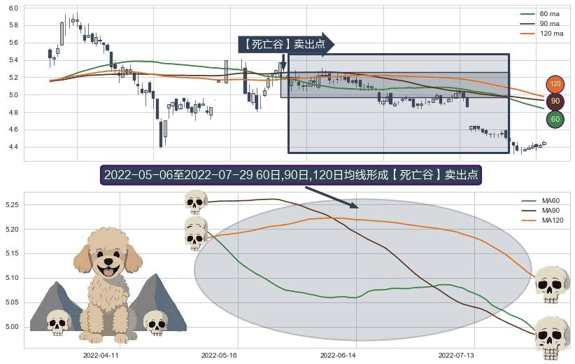 ⚀ 2022-05-10-日至2022-07-29-日显现 60日-90日-120日均线 【死亡谷】卖出点 看空信号,后市看跌,卖出