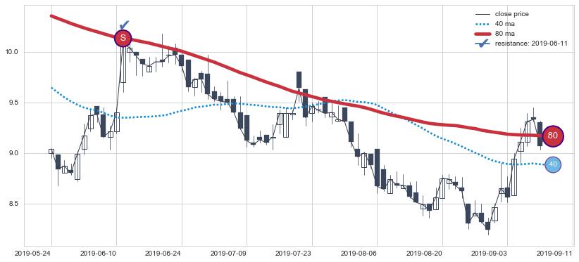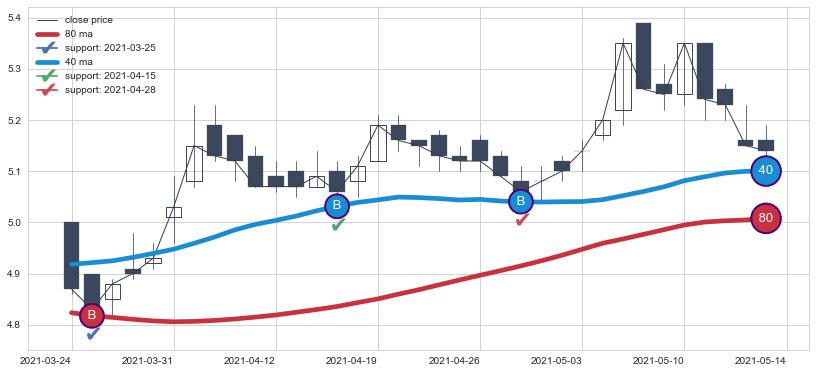 ➢ 最优均线组合共正确确认支撑阻力信号5处,正确确认率 71.43%