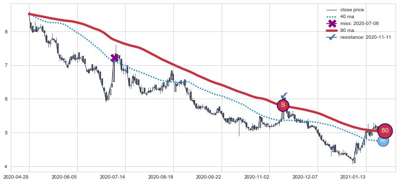 ⚅ 卖点向下突破均线后,价格走势很纠结,不断在均线周围试探,有再次上探突破均线的可能