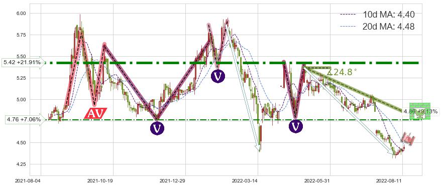 ♘ 阻力价格位4.76,可信任强度50.63%,距离最后交易2022-08-12形成的收盘价格4.45相差 +7.06%