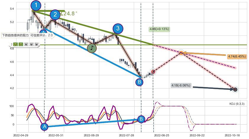 ♘ 在最后的下跌阶段2022-05-04至2022-08-11,存在 持续未破位的阻力位 ,阻力价格4.86,可信任强度63.93%,其距离最后价格4.45相差 +9.13%