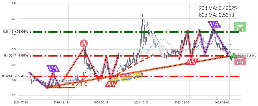 ♘ 支撑价格位0.32443,可信任强度97.83%,距离最后交易2022-08-12形成的收盘价格0.48000相差 -32.41%