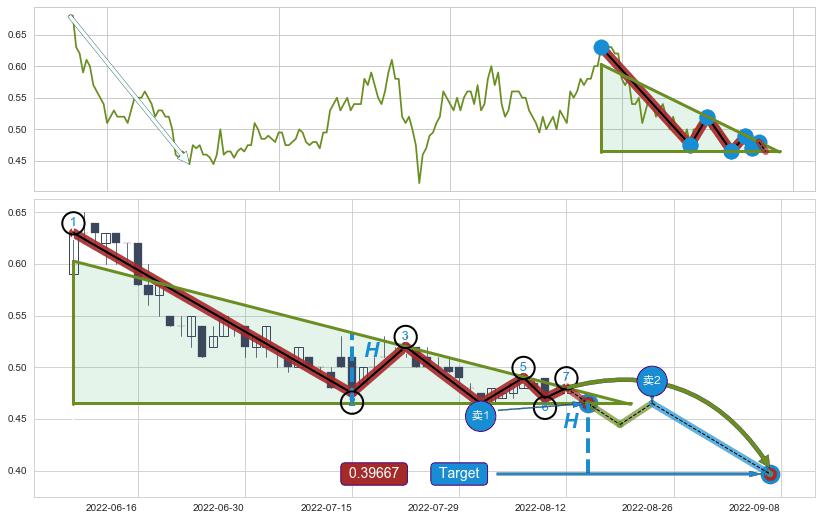 ➣ 【未确认突破,预测即将形成突破】下降三角形整理起点:2022-06-08, 预测突破点:2022-08-16,形态共49交易日