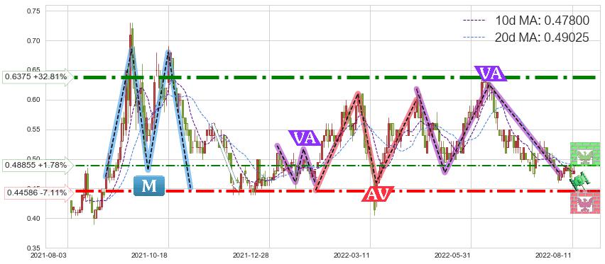 ♘ 阻力价格位0.48855,可信任强度43.01%,距离最后交易2022-08-12形成的收盘价格0.48000相差 +1.78%