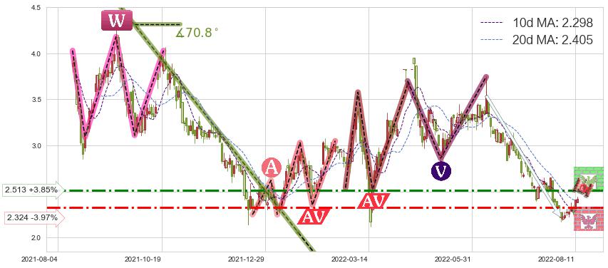 ♘ 阻力价格位2.513,可信任强度62.72%,距离最后交易2022-08-12形成的收盘价格2.420相差 +3.85%
