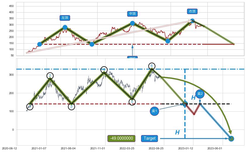 ➢ 最小反转跌幅→𝐇: 190.20 (三重顶波峰高点到两个波谷连线的垂直距离)