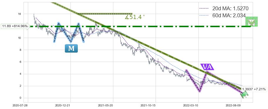 从2022-01-20至2022-08-12,共包含136个交易日,阶段股价下跌-95.30%,阶段股价变动位移路程比: 1 : 5