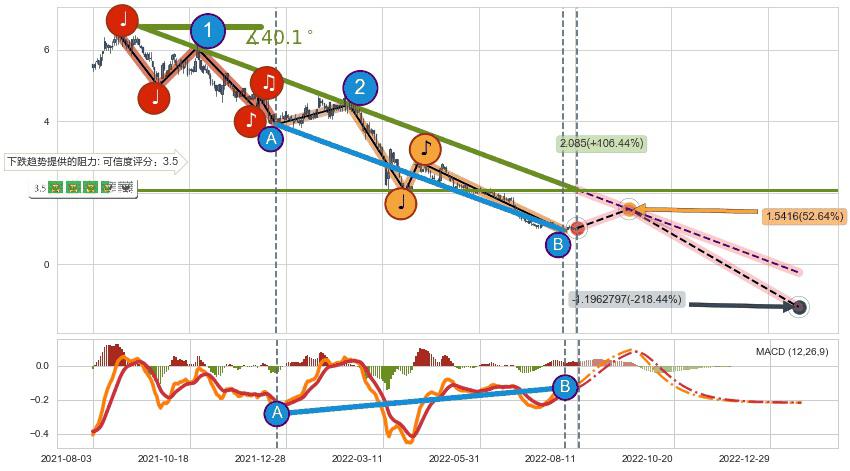 ♘ 在最后的下跌阶段2021-08-20至2022-08-11,存在 持续未破位的阻力位 ,阻力价格2.085,可信任强度79.21%,其距离最后价格1.0100相差 +106.44%