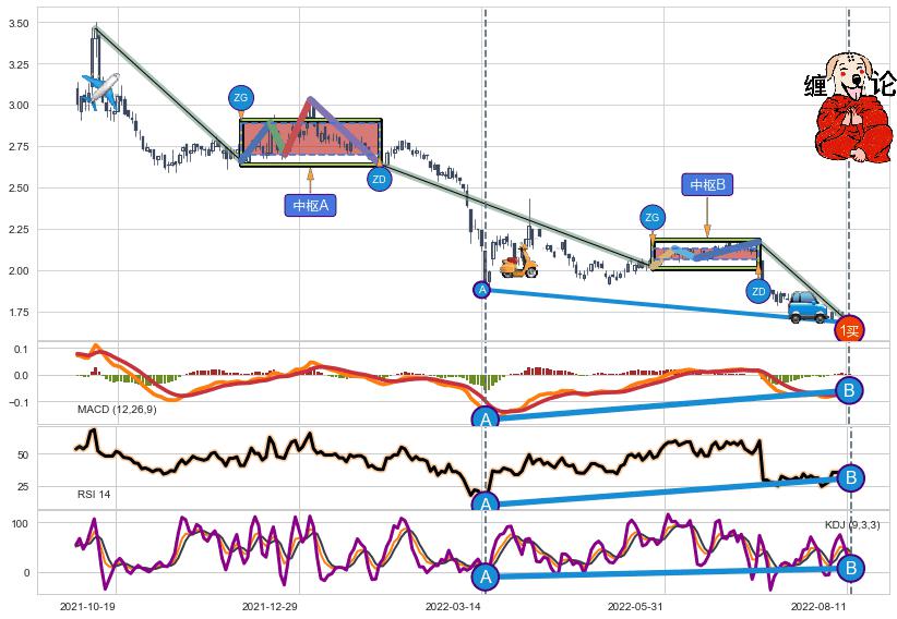 ➢ 智能识别已发生事件:缠论第一类买点【买❶】→(2022-08-12: 1.6800 )