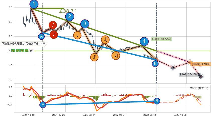♘ 在最后的下跌阶段2021-10-07至2022-08-12,存在 持续未破位的阻力位 ,阻力价格1.993,可信任强度82.45%,其距离最后价格1.6800相差 +18.62%