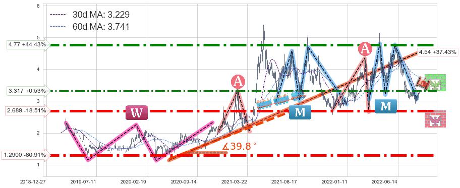 ♘ 阻力价格位3.317,可信任强度66.56%,距离最后交易2022-08-12形成的收盘价格3.300相差 +0.53%