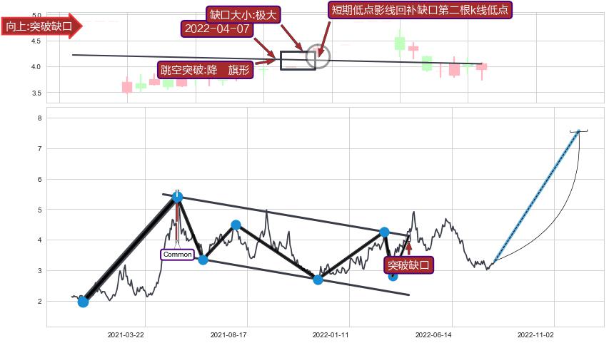 ➢ 【买1】: 激进型 买点 →(2022-04-07: 4.12 )形成突破降⚑旗形【整理】形态