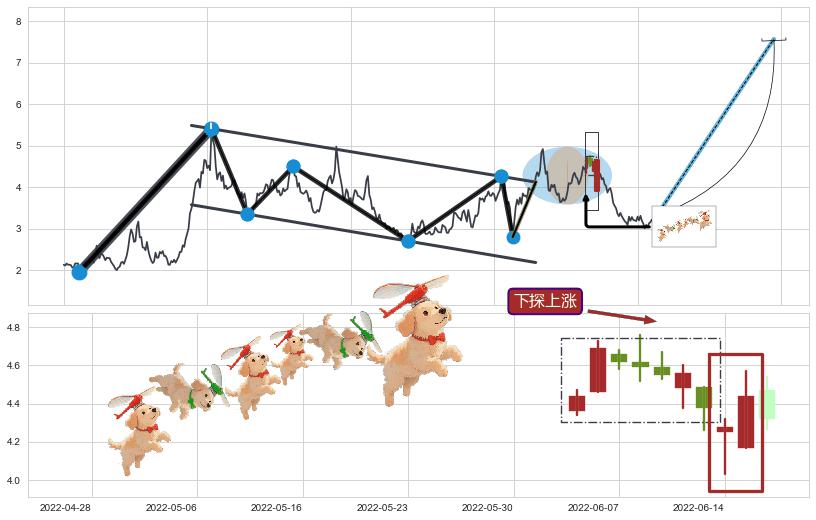 ➢ 低点影线(2022-04-08: 4.19 )→回踩→第二根k线低点(2022-04-07: 4.25 )