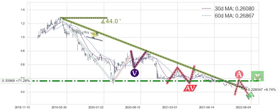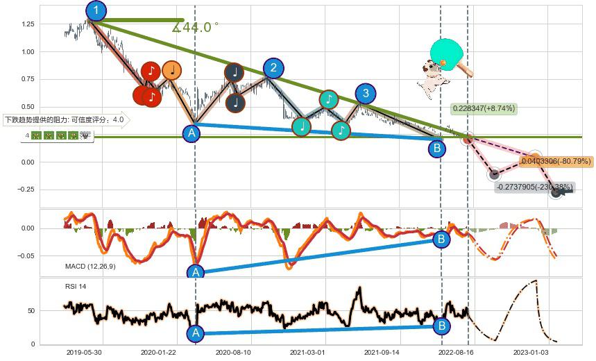 ♘ 在最后的下跌阶段2019-04-24至2022-04-21,存在 持续未破位的阻力位 ,阻力价格0.228347,可信任强度82.64%,其距离最后价格0.210000相差 +8.74%