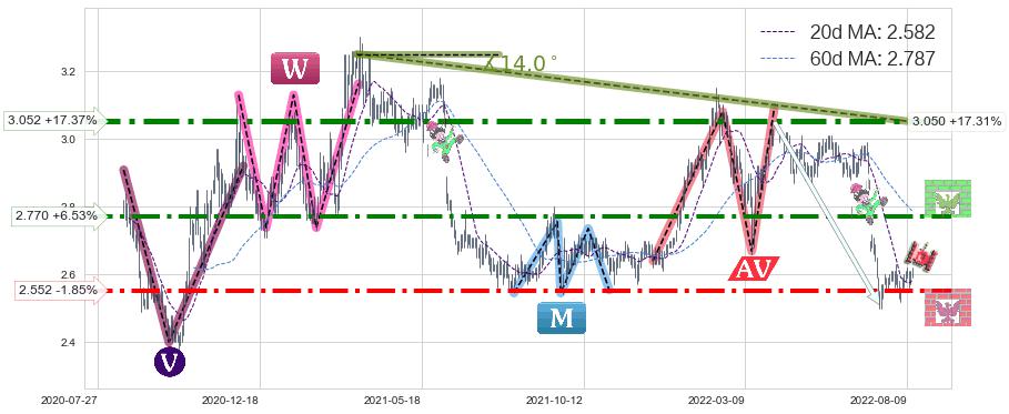 ♘ 阻力价格位3.052,可信任强度93.51%,距离最后交易2022-08-12形成的收盘价格2.600相差 +17.37%