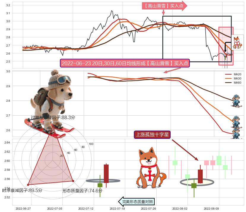 | 2 🅚:上涨两颗星 | 上涨三颗星 ➕ 🎢:【高山滑雪】买入点均线组合买入点信号形成后,猜想后续下行结束,持续反弹上涨(均值回复) ☞ 看多信号 ⇥ 【均线】交织【🅚线】⇥ 综合量化分数: 53 | > |