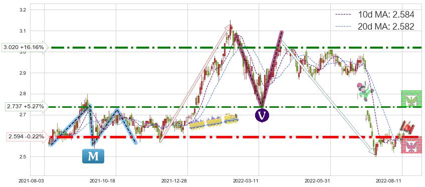 ♘ 支撑价格位2.594,可信任强度89.07%,距离最后交易2022-08-12形成的收盘价格2.600相差 -0.22%