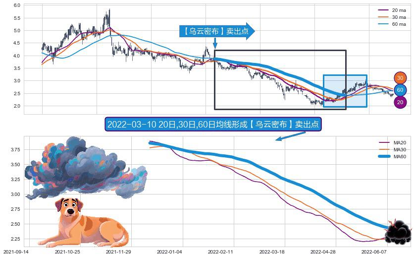 形态多维评估: ⚀ 2021-12-10日-2022-06-10日显现 20日-30日-60日均线 【乌云密布】卖出点 看空信号,后市看跌,卖出