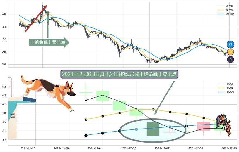 形态多维评估: ⚀ 2021-12-06日显现 3日-8日-21日均线 【绝命跳】卖出点 看空信号,后市看跌,卖出