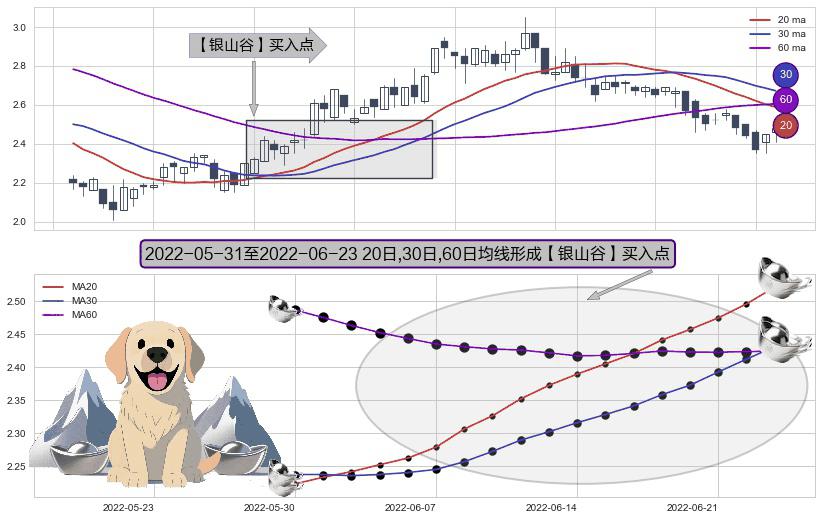 形态多维评估: ⚀ 2022-06-01-日至2022-06-23-日显现 20日-30日-60日均线 【银山谷】买入点 看多信号,后市看涨,买入