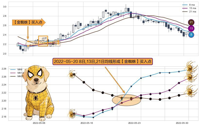 形态多维评估: ⚀ 2022-05-20日显现 8日-13日-21日均线 【金蜘蛛】买入点 看多信号,后市看涨,买入