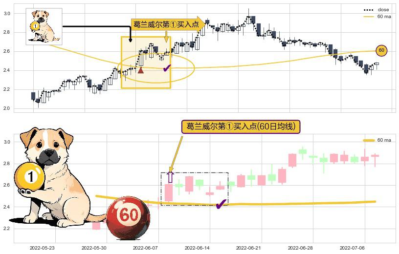 形态多维评估: ⚀ 2022-06-08-日显现 葛兰威尔均线 60日均线 第买①入点 走势反转见底信号,后市看涨,买进信号
