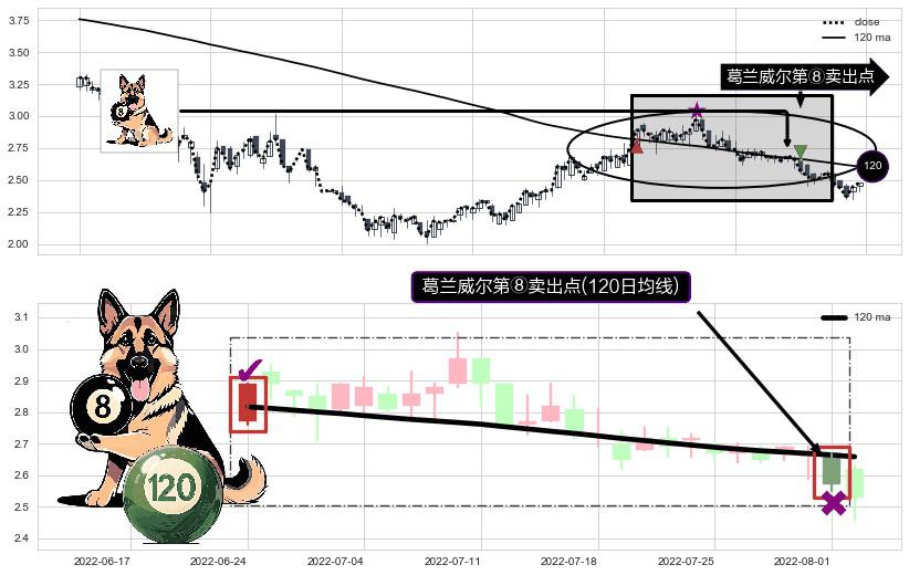 形态多维评估: ⚀ 2022-08-01-日显现 葛兰威尔均线 120日均线 第⑧卖出点 下降趋势的中继信号,后市看跌,卖出信号