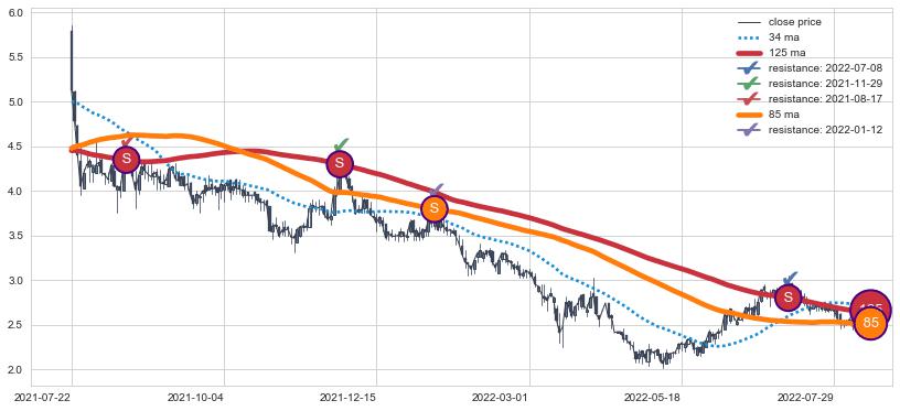 下跌趋势2021-07-22-2022-08-08,均线85, 125确认关键阻力4处