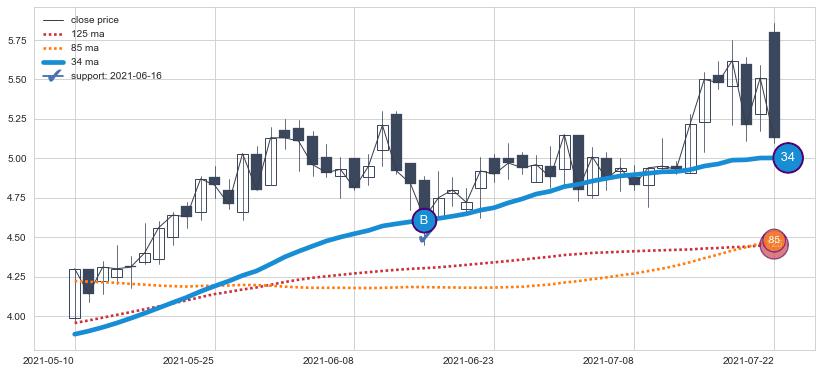上涨趋势2021-05-10-2021-07-22,均线34确认关键支撑1处