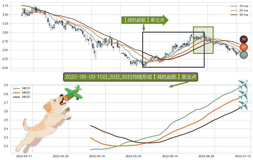 形态多维评估: ⚀ 2022-05-10日-2022-07-08日显现 10日-20日-30日均线 【战机起航】卖出点 看空信号,后市看跌,卖出