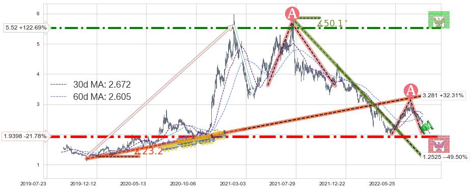 ♘ 支撑价格位1.9398,可信任强度92.56%,距离最后交易2022-08-12形成的收盘价格2.480相差 -21.78%