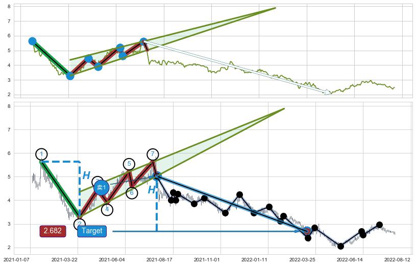 ➢ 最小中继整理跌幅→𝐇: 2.340 (𝐇楔型旗杆的长度:楔型起点→顶点)