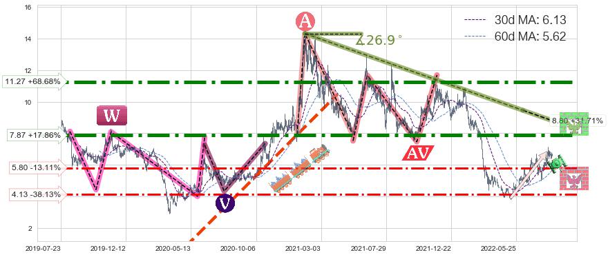 ♘ 阻力价格位7.87,可信任强度85.82%,距离最后交易2022-08-12形成的收盘价格6.68相差 +17.86%