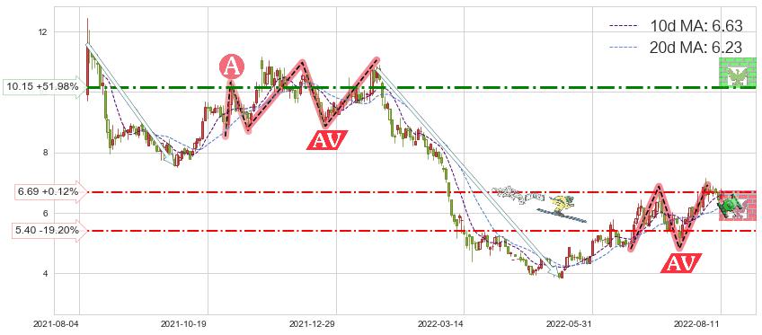 ♘ 阻力价格位10.15,可信任强度58.52%,距离最后交易2022-08-12形成的收盘价格6.68相差 +51.98%
